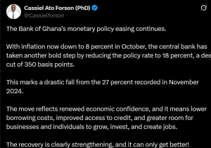 In a post shared on X, the minister said the central bank’s move is aligned with Ghana’s improving macroeconomic environment, especially the consistent decline in inflation, which has fallen to 8 per cent as of October 2025, a dramatic drop from 27 per cent in November 2024.