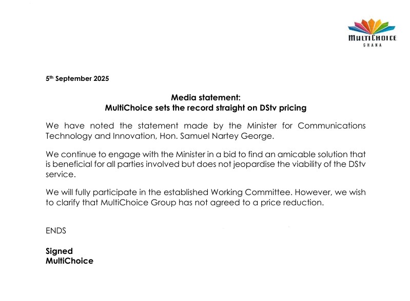 In a press release issued on Friday, the pay-TV operator stated it had “not agreed to a price reduction”, contrary to public remarks made by the Minister for Communication, Digital Technology and Innovation, Samuel Nartey George.
