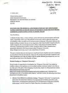 The petition, submitted to the Jubilee House on Thursday, June 12, 2025, and signed by Asantewaa Asante—a known sympathiser of the opposition New Patriotic Party (NPP)—accuses Mr. Tanko-Computer of holding a fraudulent PhD in Public Administration, allegedly awarded in 2026 by Kingsnow University, an institution the petitioner claims is unaccredited and nonexistent.